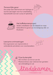 Zo is er een potje voor persoonlijke groei (denk aan een curusus of opleiding), een koffiekannenproject, verbindende activiteiten en een Fijne Buitenplek.